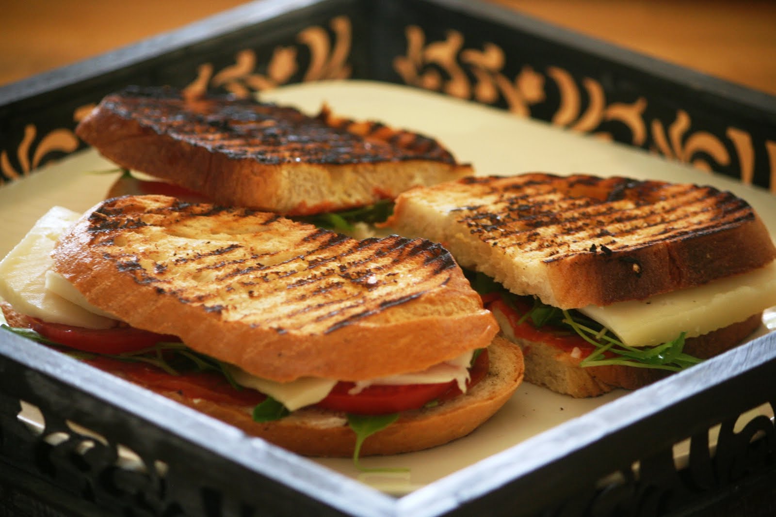 A mai reggelünk olyan gyorsan elrohant, hogy 11 óra körül kaptunk észbe először, hogy enni kellene valamit... benéztem a hűtőbe, és az ott lévő dolgokból, valamit a nagy agyagcserepeinkben cseperedő ruccolából pár perc alatt csodálatosan finom szendvicset készítettem, amit tálalás előtt grill-lapon gyorsan átpirítottam.