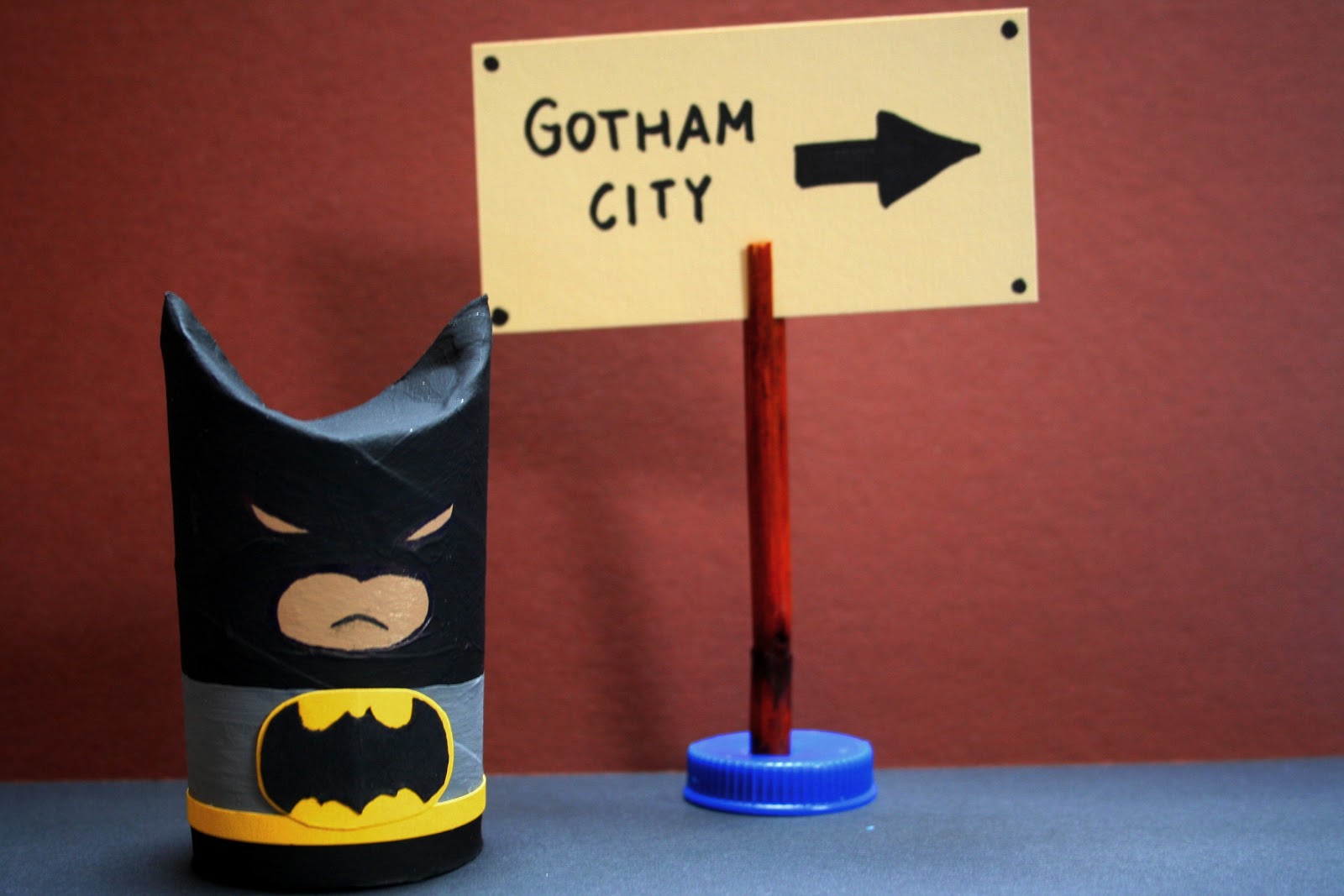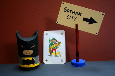 A sorozat első darabjának egy elvitathatatlanul szuper szuperhőst választottam, és ez pedig nem más, mint a már említett denevérember: nála csak annyit alakítottam a gurigán, hogy a tetejét kétoldalt benyomtam, így alakultak ki a fülek - minden egyéb festés és egy kis színespapír-kivágás és ragasztás dolga volt.
