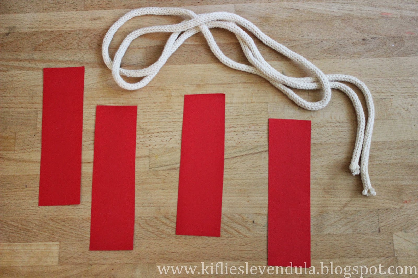 Amíg száradt, addig piros kartonból négy egyforma csíkot vágtam, és kikészítettem egy vastag zsinórt.