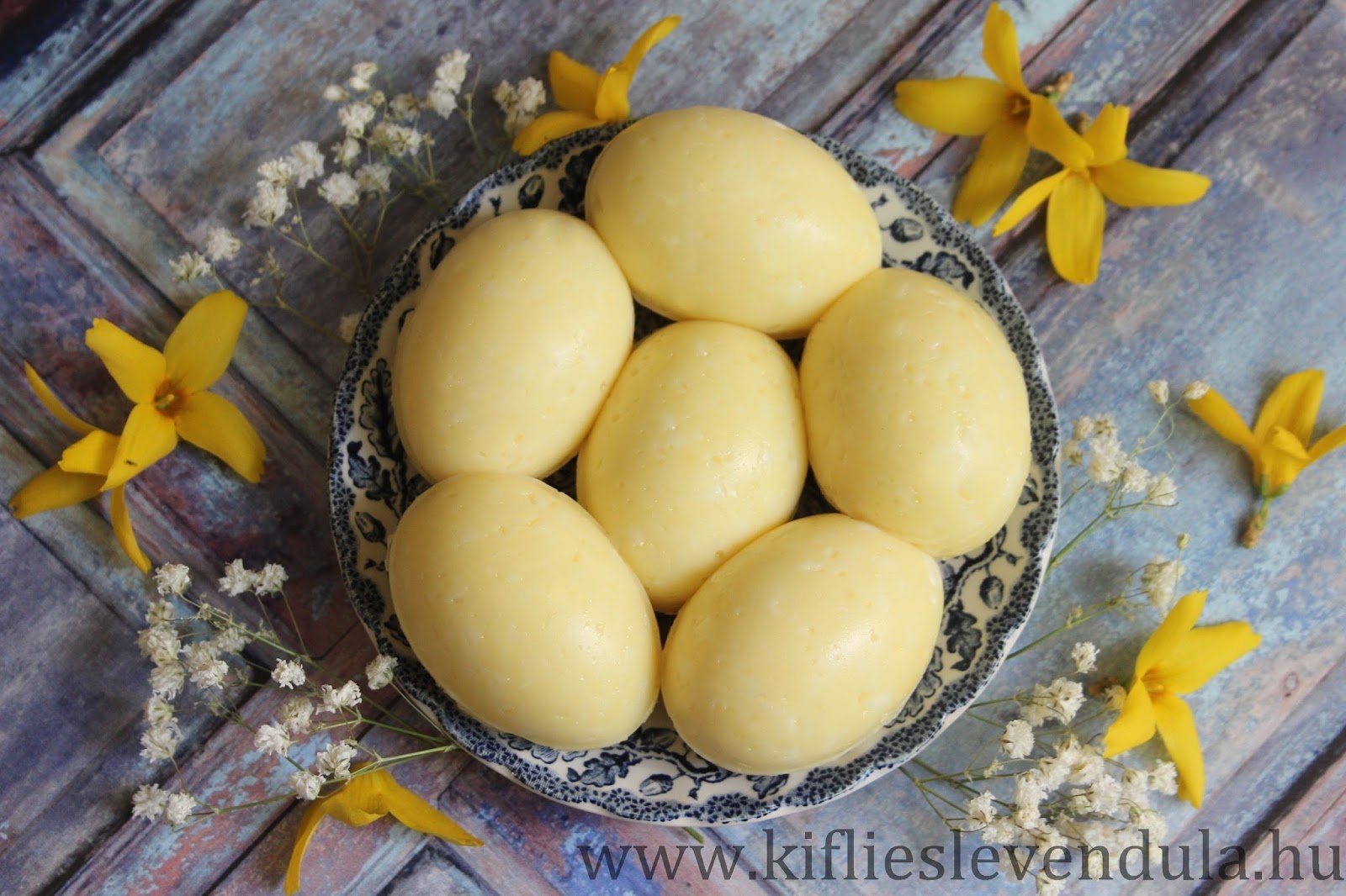 Kihűlés után szétnyitottam a tojásokat, és kivettem a sajtokat - gyönyörű tojásformájúak lettek, többen keménytojásnak gondolták első ránézésre :-)
