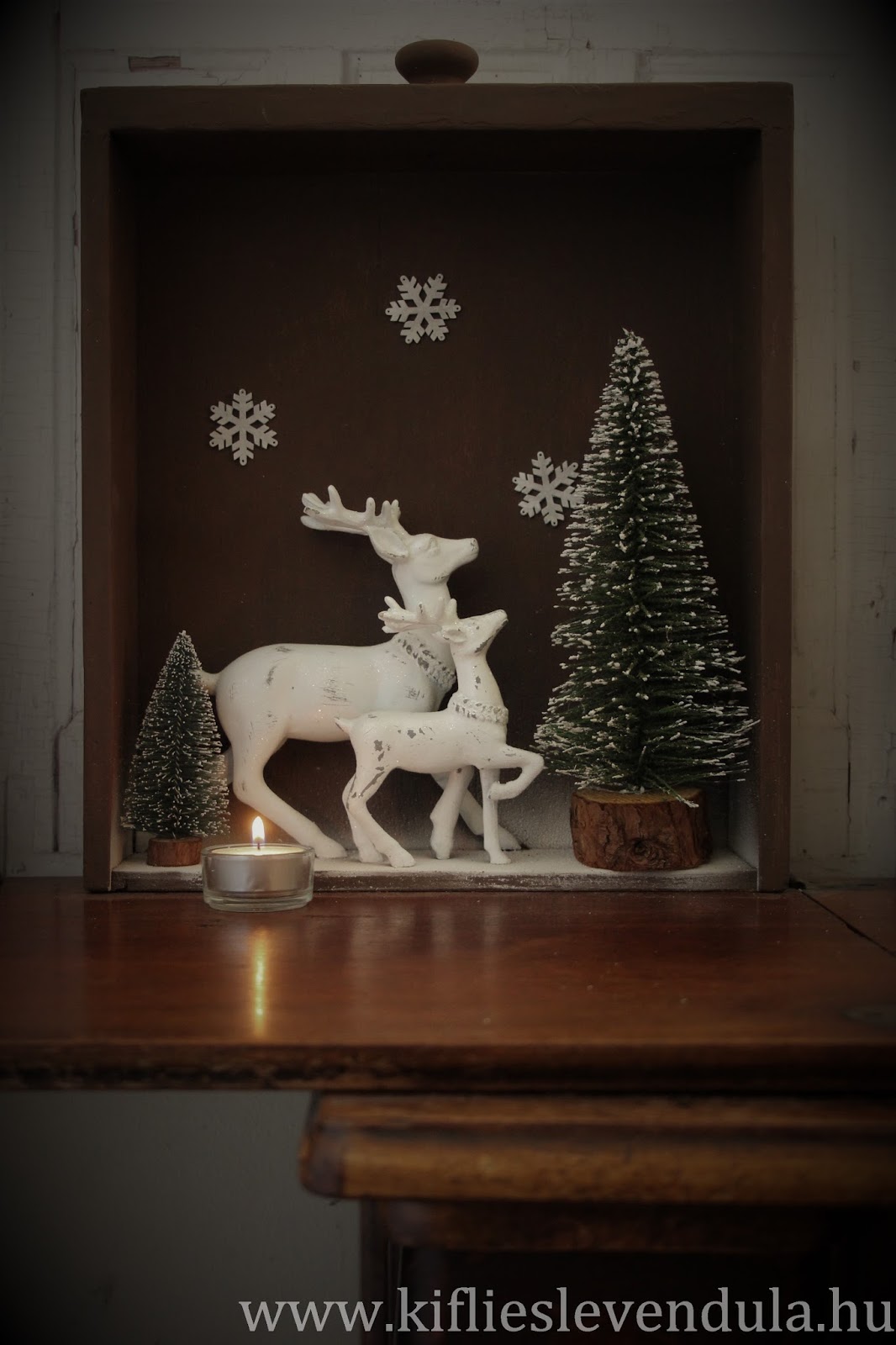 És innen már egyszerű volt a dolgom. A fákat és a szarvasokat erős ragasztóval rögzítettem a fiókba, fehér dekorspray-vel lefújtam az alaprészt, és végül felragasztottam a fa hópelyheket.