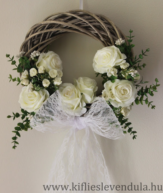 Kezdődik a házasságkötések szezonja - kaptam is egy megbízást esküvői ajtókoszorú készítésére. Az imádott papírvirágjaim most nem jöhettek szóba, mivel egy kültéri ajtódísz esetében fontos az időjárás-állóság, így alapanyagként selyemvirágokat választottam.