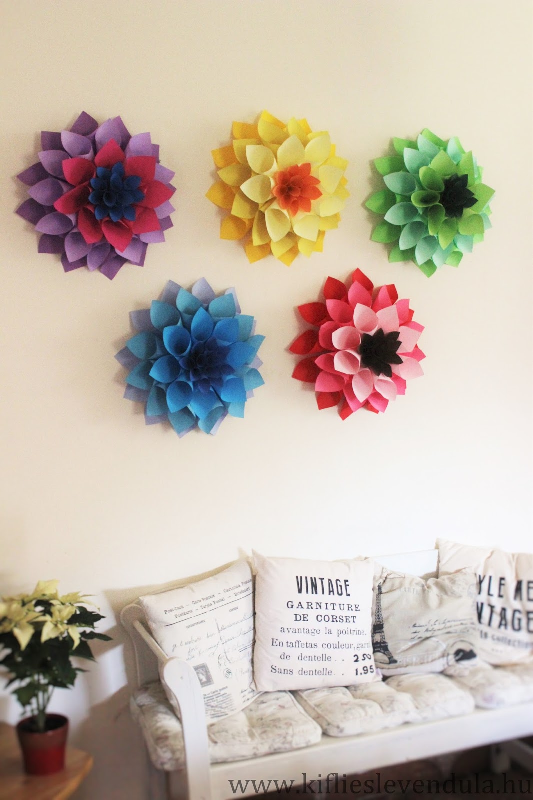 Fontos tudni, hogy a kisnagylányom betöltötte 11. évét, és most ott tartunk, hogy valóban, kicsinek már nagy, nagynak még kicsi - ezért le kellett szednünk a szobája falát borító összes "kicsis" faliképet, a helyükre pedig egyrészt Harry Potter-plakátok kerültek, másrészt semmi. Ugyanis a fennmaradó üres helyre valamilyen "lányos" dekorációt tervezett a szobatulajdonos, de túl nagy lelkesedést nem tanúsított a felvetett vagy ötven ötletre. Amikor azonban meglátta a fent említett papírvirágokat, egy szempillantás alatt eldöntötte, hogy neki pontosan ezek kellenek - illetve nagyon-nagyon szépen kérte őket.